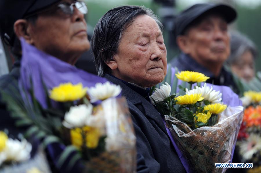 Survivor of Nanjing Massacre Xia Shuqin mourns the Nanjing Massacre victims in front of a wall inscribed the name list of victims at the Memorial Hall of the Victims in Nanjing Massacre by Japanese Invaders on the Qingming Festival in Nanjing, capital of east China's Jiangsu Province, April 5, 2015. Japanese troops captured Nanjing, then China's capital, on Dec. 13 of 1937 and started a 40-odd-day slaughter. More than 300,000 Chinese soldiers who had laid down their arms and civilians were murdered, and over 20,000 women were raped. (Xinhua/Han Yuqing)