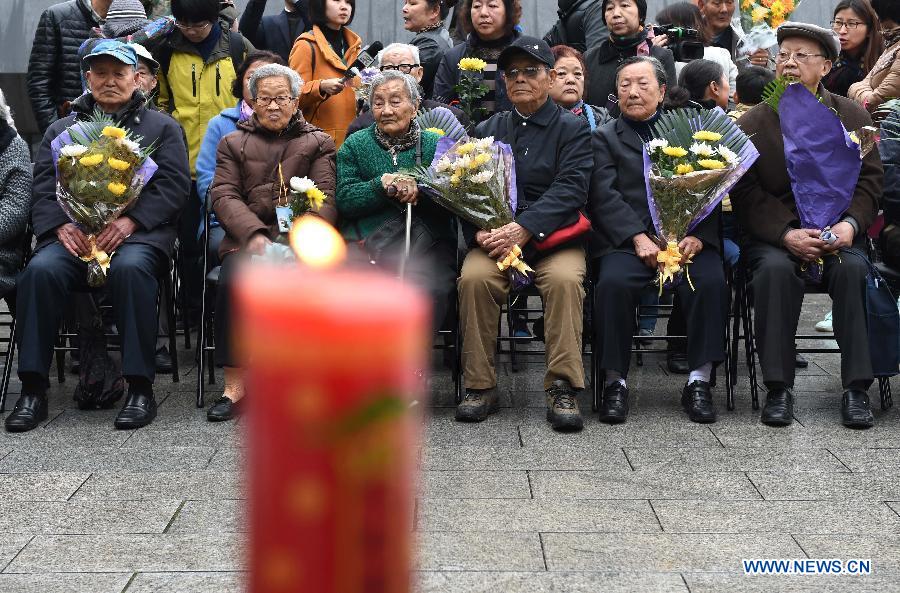 Survivors (front row) and relatives of victims of Nanjing Massacre take part in a ceremony to mourn the Nanjing Massacre victims in front of a wall inscribed the name list of victims at the Memorial Hall of the Victims in Nanjing Massacre by Japanese Invaders on the Qingming Festival in Nanjing, capital of east China's Jiangsu Province, April 5, 2015. Japanese troops captured Nanjing, then China's capital, on Dec. 13 of 1937 and started a 40-odd-day slaughter. More than 300,000 Chinese soldiers who had laid down their arms and civilians were murdered, and over 20,000 women were raped. (Xinhua/Sun Can)
