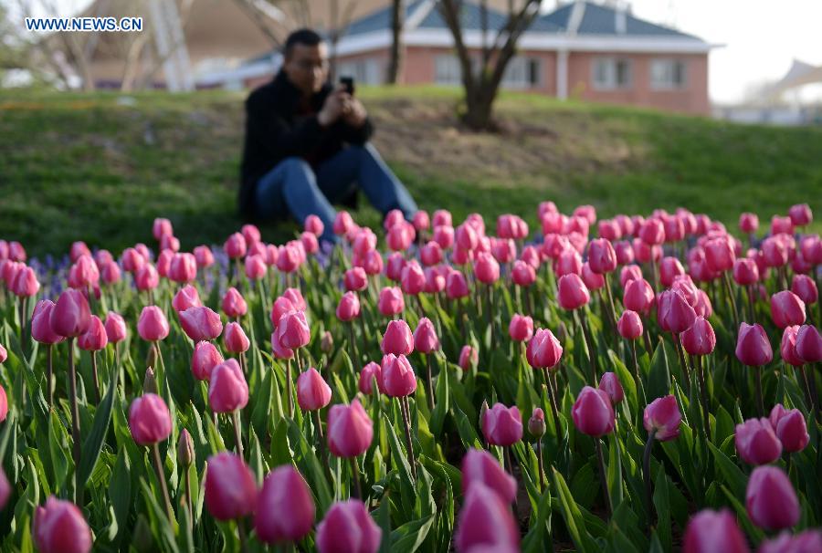 A citizen takes photos of the blooming tulips at Shijiazhuang botanical garden in Shijiazhuang, capital of north China's Hebei Province, April 6, 2015. The tulips here attracted many tourists to the garden during the three-day holiday of Qingming Festival, or Tomb-sweeping Day. (Xinhua/Wang Xiao)