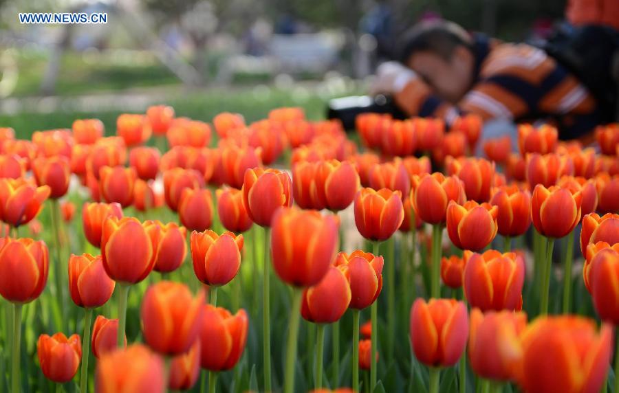 Photo taken on April 6, 2015 shows the blooming tulips at Shijiazhuang botanical garden in Shijiazhuang, capital of north China's Hebei Province. The tulips here attracted many tourists to the garden during the three-day holiday of Qingming Festival, or Tomb-sweeping Day. (Xinhua/Wang Xiao)