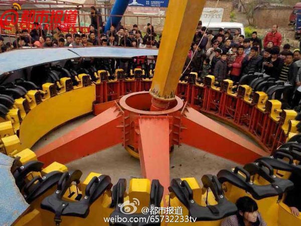 Nineteen people were flung off the recreational facility at a local commercial street in Changhuan county after the facility's spin cracked. (Photo/Weibo) |