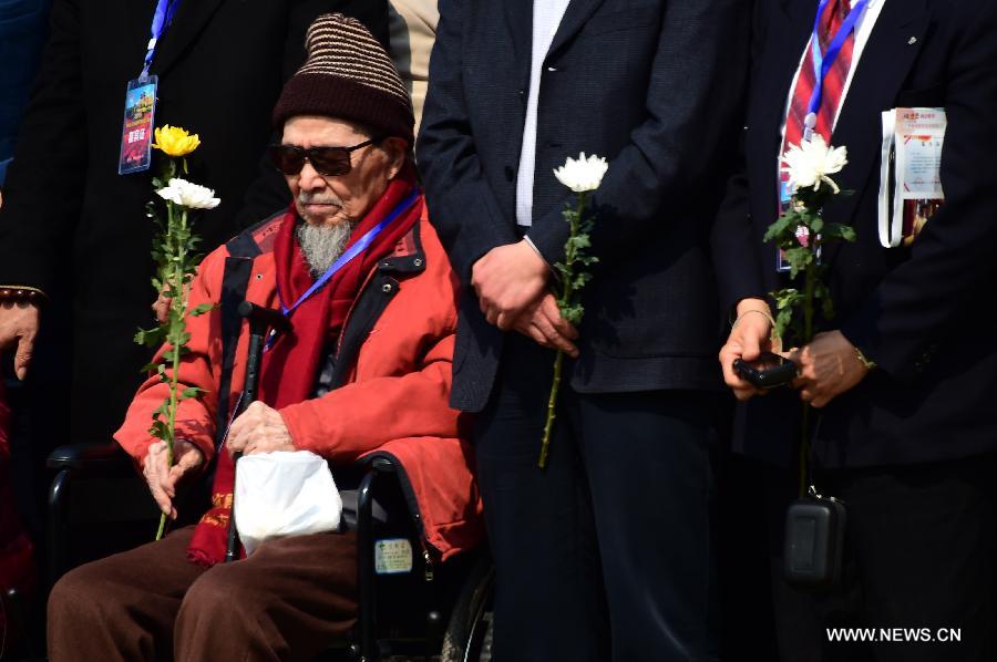 Veteran Shao Jingdou, 101, touches the bullet holes on a wall at the Relics Park of the Tai'erzhuang Battle during a ceremony to celebrate the 77th anniversary of the victory of the battle in Tai'erzhuang, east China's Shandong Province, April 8, 2015. The Tai'erzhuang Battle, a battle of the Anti-Japanese War (1937-1845) in 1938 between Chinese and Japanese armies, was the first major Chinese victory of the war. It humiliated the Japanese military and its reputation as an invincible force. Meanwhile, it greatly boosted morale of Chinese people. (Xinhua/Guo Xulei)
