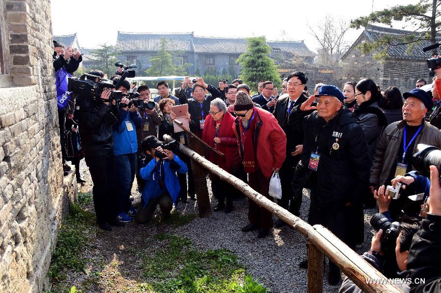 Veteran Shao Jingdou, 101, makes a military salute in front of a bullet-hit wall at the Relics Park of the Tai'erzhuang Battle during a ceremony to celebrate the 77th anniversary of the victory of the battle in Tai'erzhuang, east China's Shandong Province, April 8, 2015. The Tai'erzhuang Battle, a battle of the Anti-Japanese War (1937-1845) in 1938 between Chinese and Japanese armies, was the first major Chinese victory of the war. It humiliated the Japanese military and its reputation as an invincible force. Meanwhile, it greatly boosted morale of Chinese people. (Xinhua/Guo Xulei)