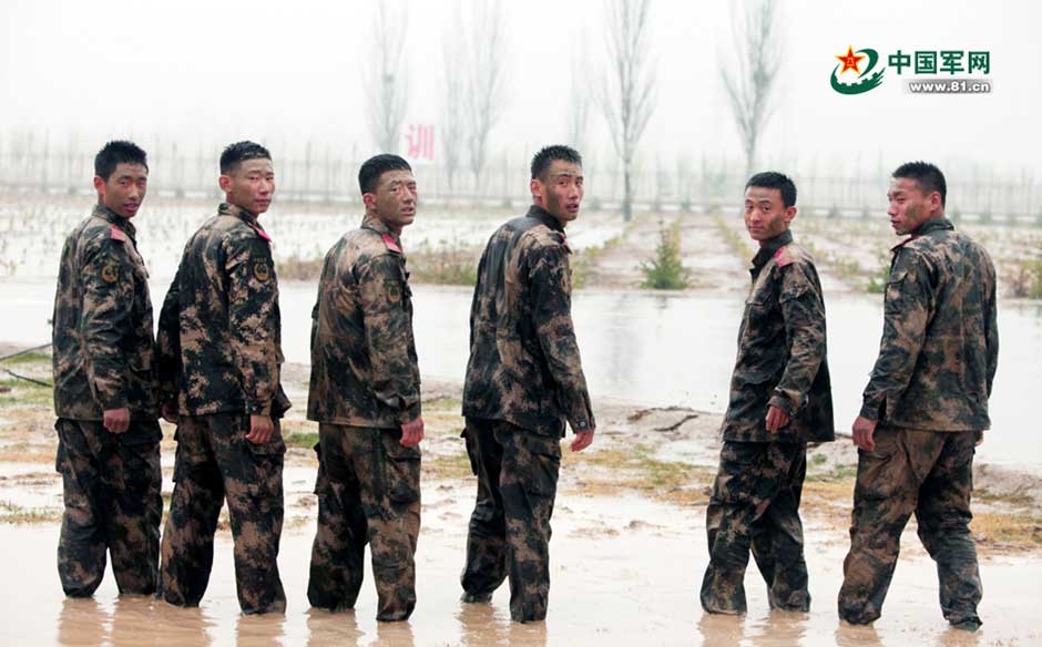 Yinchuan, northwest China's Ningxia Hui Autonomous Region, saw a moderate rain on April 1, 2015. SWAT officers there trained in mire to improve their restraint techniques and fighting skills on that day.(Photo/81.cn)