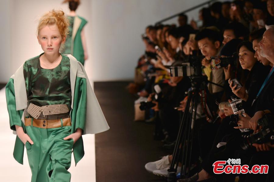 A model presents a creation during Shanghai Fashion Week Fall/Winter 2015 in Shanghai, April 8, 2015. Nearly 50 shows will be held in the important fashion event from April 8 to 15, featuring both Chinese and international brands. (Photo: China News Service/Yuan Jing)