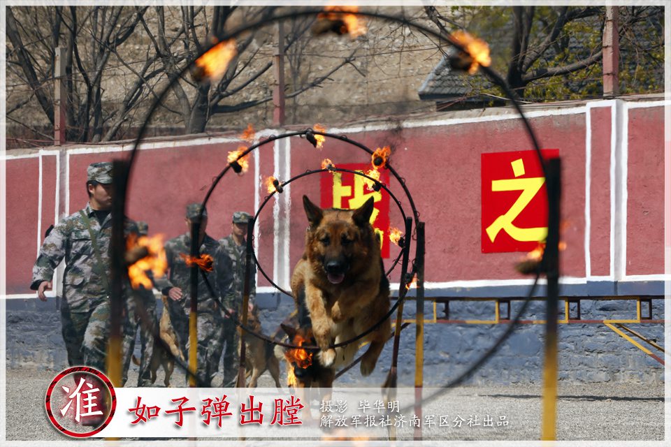 Soldiers from Jinan Military Region train their dogs to surmount obstacles, go through fire circles, cross bridges and catch things rapidly. Those dogs are trained to sit, lie down, stand, walk and bite. (Chinamil.com.cn/Bi Huaming)