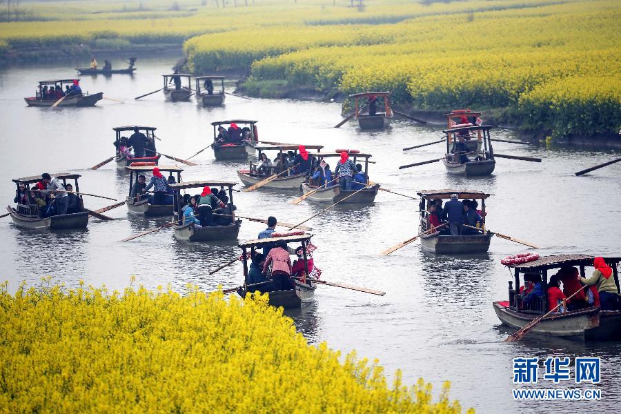 On April 5, 2015, visitors enjoy the beautiful rape flowers by boats in Xinghua scenic spot of Jiangsu province. (Xinhua/Tang Dehong)