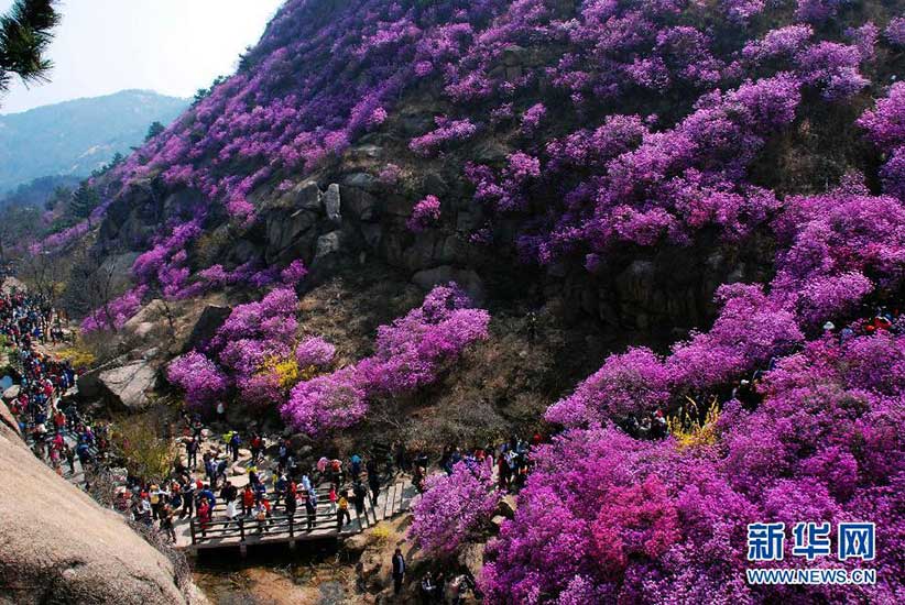 People watch wild azaleas in full bloom in Dazhu Mountain in Qingdao, east China's Shandong province on April 5, 2015. (Xinhua/Liu Zhonghua)
