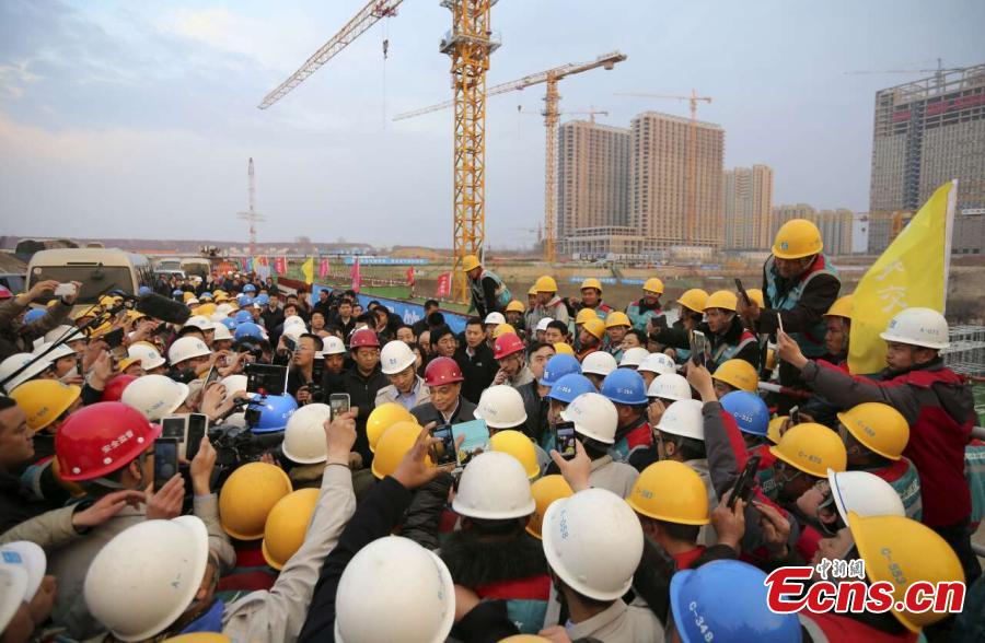 Premier Li Keqiang (C) is surrounded by workers at the construction site of a transportation hub in Changchun, the capital of Northeast China’s Jilin province, April 9, 2015. Li emphasized the important role of investment in driving up the economy. (Photo: China News Service/Liu Zhen) |