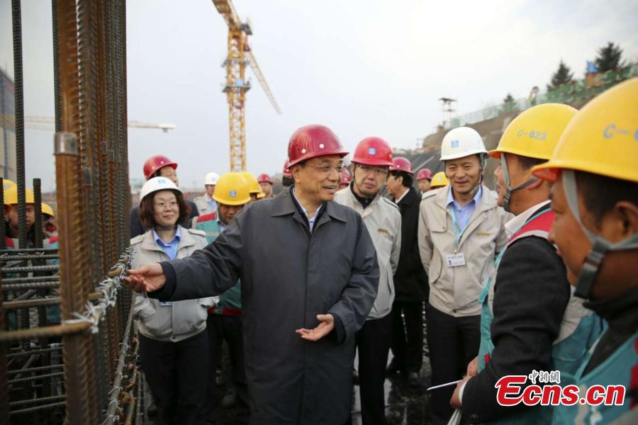 Premier Li Keqiang (L) visits the construction site of a transportation hub in Changchun, the capital of Northeast China’s Jilin province, April 9, 2015. Li emphasized the important role of investment in driving up the economy. (Photo: China News Service/Liu Zhen) |