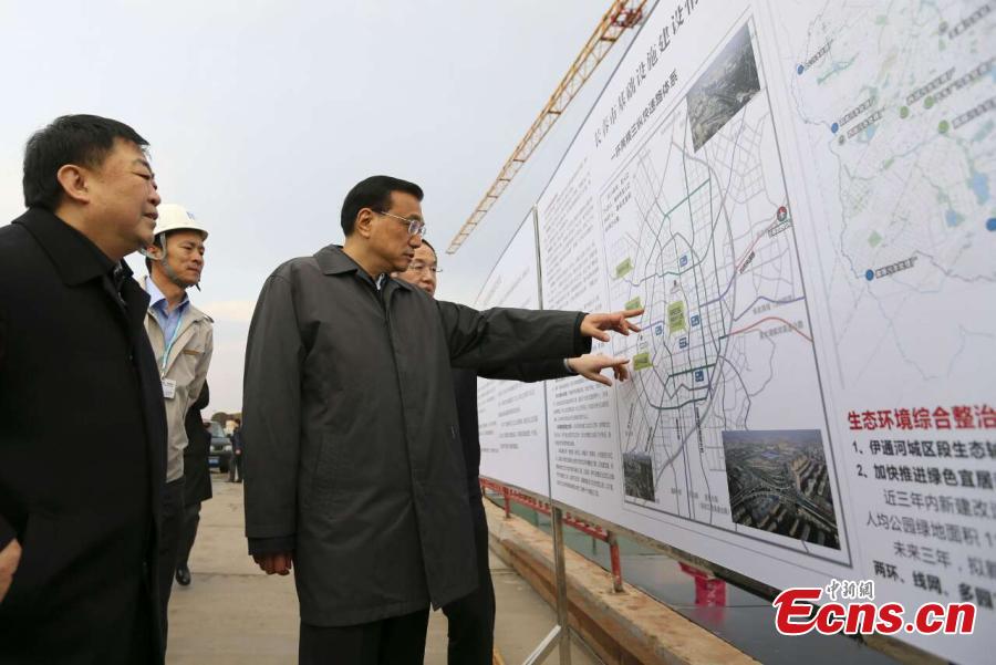 Premier Li Keqiang (R) visits the construction site of a transportation hub in Changchun, the capital of Northeast China’s Jilin province, April 9, 2015. Li emphasized the important role of investment in driving up the economy. (Photo: China News Service/Liu Zhen) |