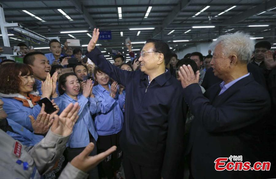 Premier Li Keqiang (C) talks with workers during his visit to a State-owned bulb factory in Changchun, the capital of Northeast China’s Jilin province, April 9, 2015. Most of more than 7,500 workers in the factory, now transformed into the country's largest wire harness manufacturing company, come from nearby communities. (Photo: China News Service/Liu Zhen) |
