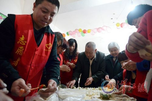 Volunteers make dumplings with elderly in Humulinxiang Community in Xiangyang on March 21.(Photo provided to People's Daily Online) |