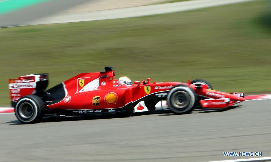 Ferrari's German driver Sebastian Vettel drives his car during the first practice session of the Formula One Chinese Grand Prix in Shanghai, east China, April 10, 2015. (Xinhua/Fan Jun)