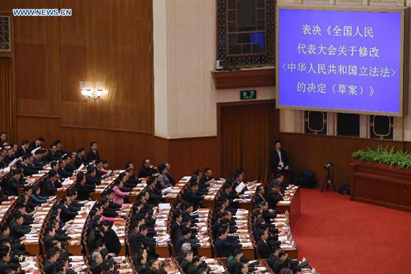 Deputies to China's 12th National People's Congress (NPC) vote during the closing meeting of the third annual session of the 12th NPC at the Great Hall of the People in Beijing, capital of China, March 15, 2015. (Xinhua/Pang Xinglei) |