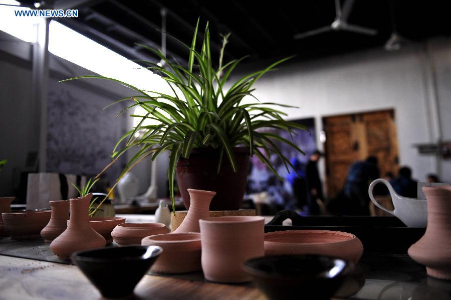 Photo taken on April 11, 2015 shows displayed chinaware in an art center transformed from an abandoned factory storage in the Minxing District in east China's Shanghai. (Xinhua/Zhang Jiansong)
