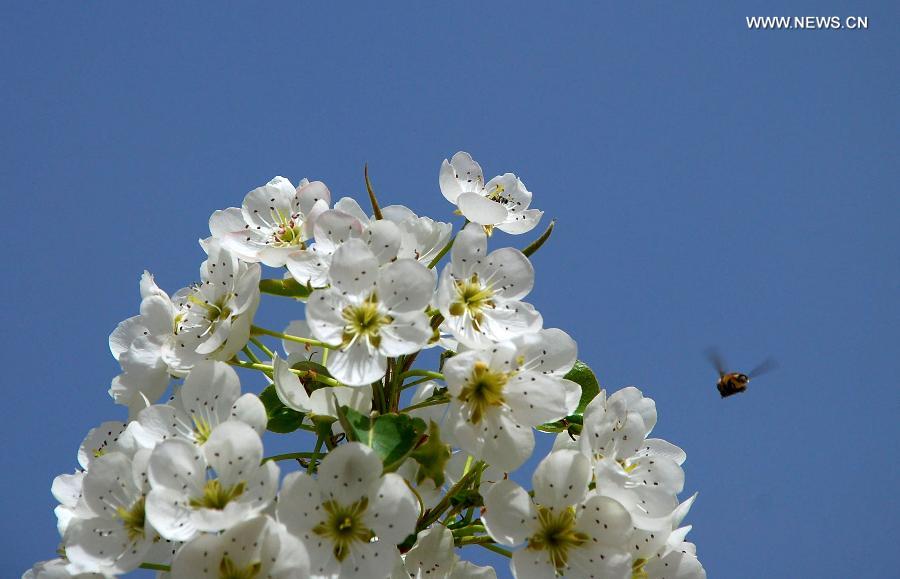 A bee flies around blooming pear flowers in Dunhuang City, northwest China's Gansu Province, April 13, 2015. (Xinhua/Zhang Xiaoliang)