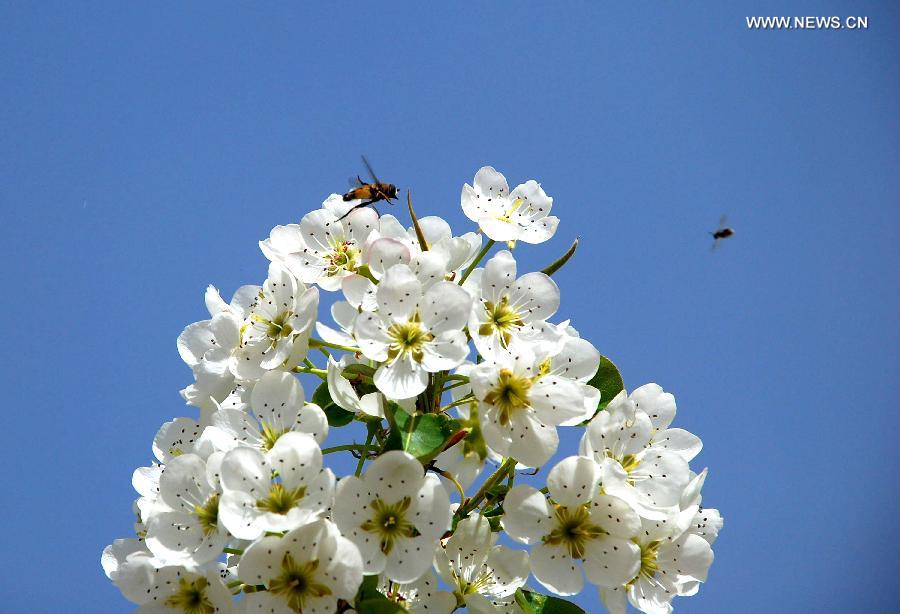 Bees fly around blooming pear flowers in Dunhuang City, northwest China's Gansu Province, April 13, 2015. (Xinhua/Zhang Xiaoliang)