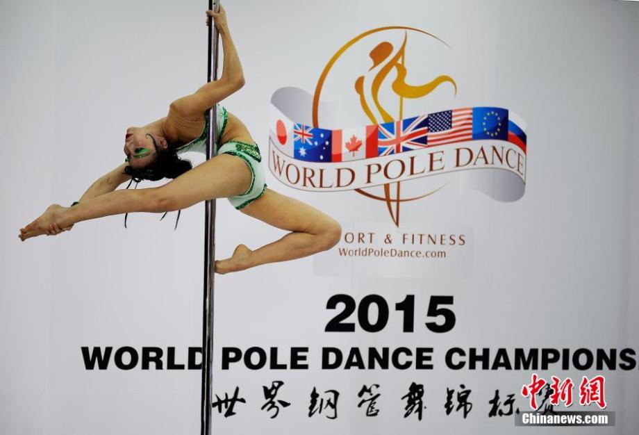 The semifinals of 2015 World Pole Dance Championships is held in China pole dance training centre on April 11, 2015. In the finals held in Beijing last Sunday, 43 contestants from 14 countries competed for singles and doubles titles. The top-notch pole dance competition was held in Asia for the first time.(Photo/Chinanews.com)