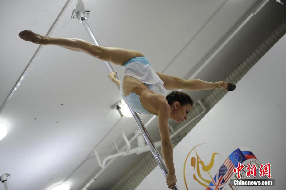 The semifinals of 2015 World Pole Dance Championships is held in China pole dance training centre on April 11, 2015. In the finals held in Beijing last Sunday, 43 contestants from 14 countries competed for singles and doubles titles. The top-notch pole dance competition was held in Asia for the first time.(Photo/Chinanews.com)