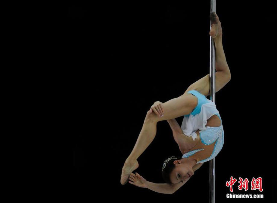 The semifinals of 2015 World Pole Dance Championships is held in China pole dance training centre on April 11, 2015. In the finals held in Beijing last Sunday, 43 contestants from 14 countries competed for singles and doubles titles. The top-notch pole dance competition was held in Asia for the first time.(Photo/Chinanews.com)