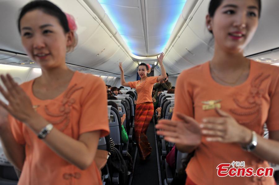 Flight attendants, donned in ethnic Dai traditional costume, splash water on passengers on a flight from Taiyuan to Kunming, Southwest China's Yunnan province, April 13, 2015. The annual water-sprinkling festival kicked off on Sunday. (Photo: China News Service/Ren Dong) |