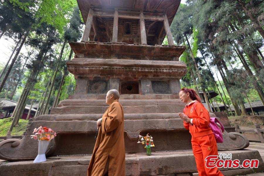 A group of investigators, including Buddhists and archaeologists, inspect a stone pagoda in Qionglai city, Southwest China’s Sichuan province, April 13, 2015. Sources say sarira of Sakyamuni, relics of the Buddha after cremation, is stored in the 800-year-old building. (Photo: China News Service/Zhang Lang)