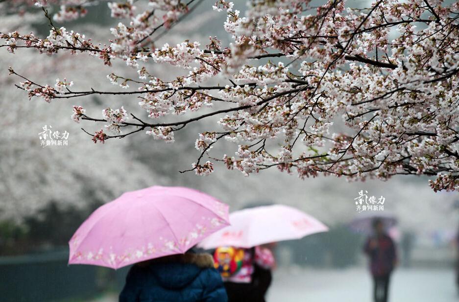 On April 13, people watch the beautiful cherry blossoms at Zhongshan Park in Qingdao City, Shandong province. In the 660-meter-long Cherry Blossom Street, they enjoyed the peak bloom and took photos of the amazing scenery in the moist airafter the rain. (Photo source: iqilu.com) |