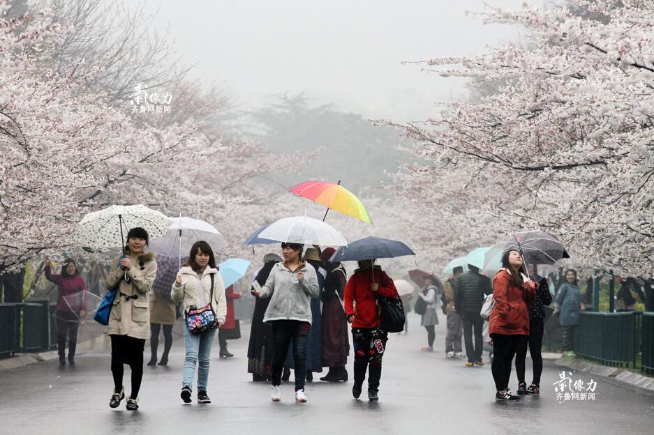 On April 13, people watch the beautiful cherry blossoms at Zhongshan Park in Qingdao City, Shandong province. In the 660-meter-long Cherry Blossom Street, they enjoyed the peak bloom and took photos of the amazing scenery in the moist airafter the rain. (Photo source: iqilu.com)