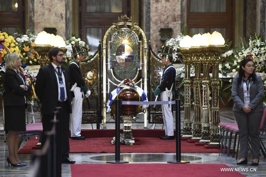 Members of an honor guard watch over the coffin of Uruguayan writer Eduardo Galeano in the Lost Steps Hall of the Legislative Palace in Montevideo, capital of Uruguay, on April 14, 2015. Uruguayan leftist writer Eduardo Galeano, author of the seminal book "Open Veins of Latin America," died Monday in Montevideo at the age of 74. (Xinhua/Nicolas Celaya)