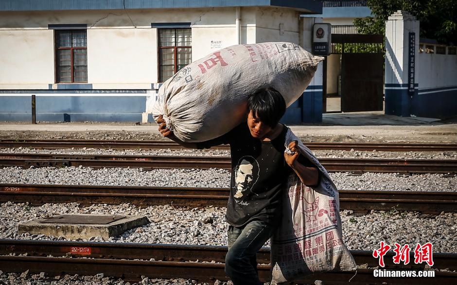 A man goes to the construction site of the highway with a sack of stones on his shoulder. He makes contribution to build the highway besides the railway, which will bring great convenience to local people. (CNS/Zhang Hao)