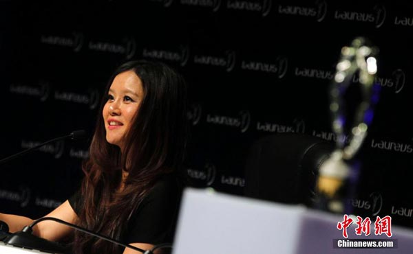 Chinese retired tennis star Li Na won the Exceptional Achievement award instead of the Sportswoman of the Year in a six-person competition, for her contribution to the promotion of the sport in China, at the 16th Laureus World Sports Awards.(Photo/CNS) |