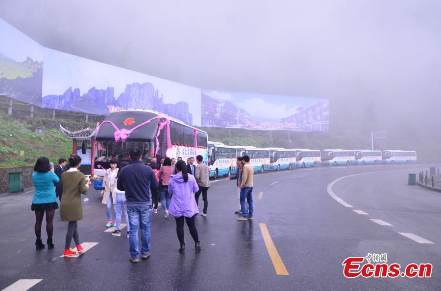 A larger coach decorated with ribbons and Chinese character Xi (meaning happiness) leads a convoy of coaches for wedding cerebration at a valley in Enshi, Central China’s Hunan province, April 15, 2015. Groom He Yi, 34, runs a travel agency and his bride Song Can is a guide, so the couple organized the procession to pass through the valley, which they say has witnessed their love, as part of their wedding celebration. (Photo: China News Service/Song Dandan) |