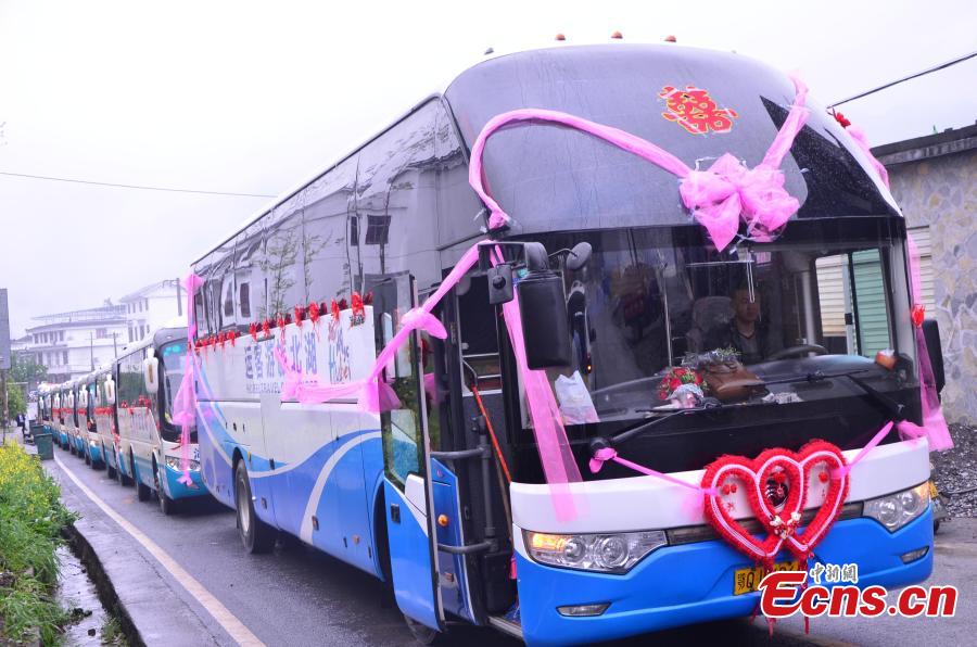 A larger coach decorated with ribbons and Chinese character Xi (meaning happiness) leads a convoy of coaches for wedding cerebration at a valley in Enshi, Central China’s Hunan province, April 15, 2015. Groom He Yi, 34, runs a travel agency and his bride Song Can is a guide, so the couple organized the procession to pass through the valley, which they say has witnessed their love, as part of their wedding celebration. (Photo: China News Service/Song Dandan) |