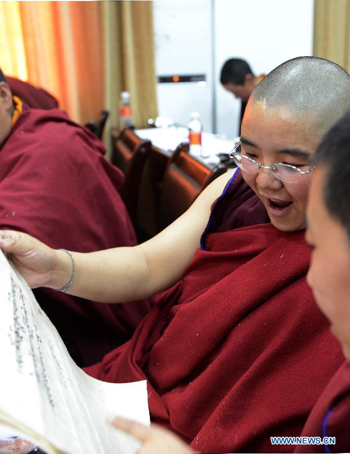 Two buddhist nuns communicate during a Tibetan calligraphy contest in Lhasa, capital of southwest China's Tibet Autonomous Region, April 16, 2015. More than 70 monks and nuns from 11 monasteries in Lhasa attended a Tibetan calligraphy contest Thursday. (Xinhua/Chogo)
