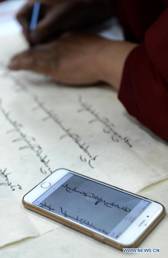 A buddhist nun transcribes words from her phone during a Tibetan calligraphy contest in Lhasa, capital of southwest China's Tibet Autonomous Region, April 16, 2015. More than 70 monks and nuns from 11 monasteries in Lhasa attended a Tibetan calligraphy contest Thursday. (Xinhua/Chogo)