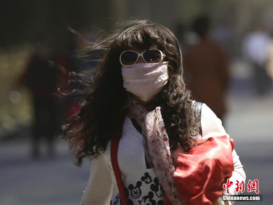 People wearing masks walk in a strong sandstorm in Beijing on April 15, 2015. Beijing was hit by moderate gale from Wednesday evening to night, and Beijing Meteorological Observatory has issued a yellow alert for sandstorm on Wednesday afternoon. (Photo/CNS)