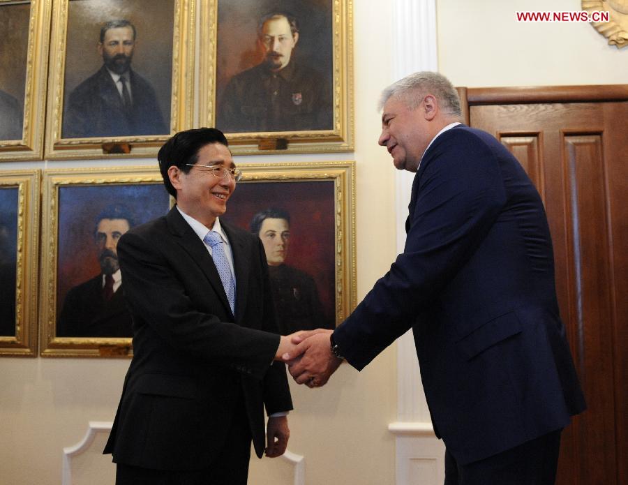 Chinese State Councilor and Public Security Minister Guo Shengkun (L) shakes hands with Russian Interior Minister Vladimir Kolokoltsev in Moscow, Russia, April 15, 2015. (Xinhua/Dai Tianfang)