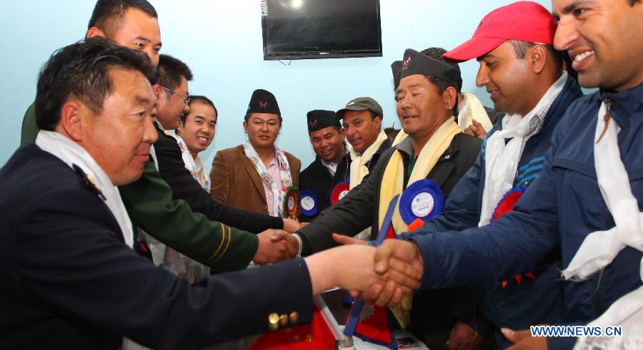 Participants from China and Nepal shake hands after an Interaction program on "Nepal's Role in the Belt and Silk Road Initiative" at Timure custom in Rasuwagadhi, Rasuwa, Nepal, April 15,2015. The main objective of the interaction was to focus on the role of Nepalese people in the development of the initiative. (Xinhua/Sunil Sharma)