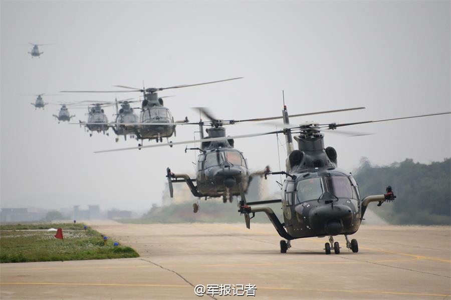 Fleets of military helicopters from Nanjing Military Region are seen flying over cities during a flight training on April 11, 2015. (Photo/81.cn)