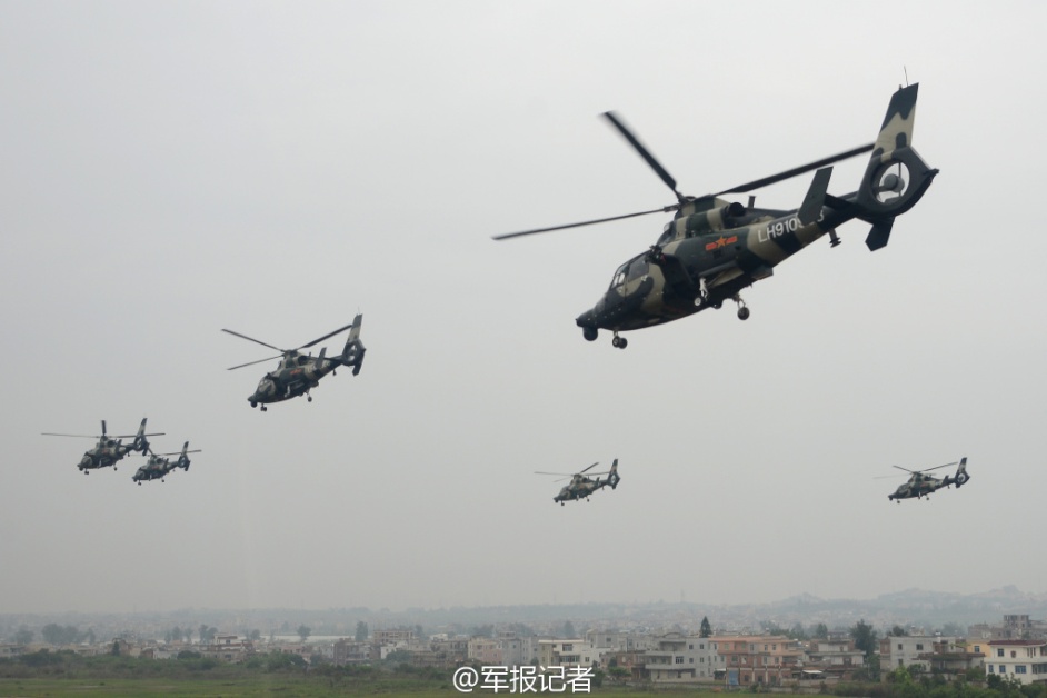 Fleets of military helicopters from Nanjing Military Region are seen flying over cities during a flight training on April 11, 2015. (Photo/81.cn)