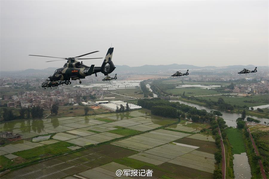 Fleets of military helicopters from Nanjing Military Region are seen flying over cities during a flight training on April 11, 2015. (Photo/81.cn)