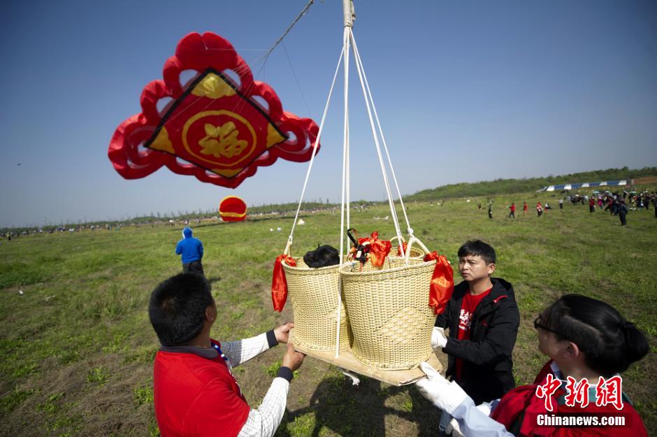 The huge Chinese-knot-shaped kite flies with three small sheep hanging on it in Changsha city, capital of Hunan province. (CNS/Yang Huafeng)