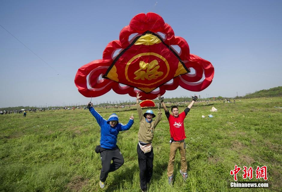 The huge Chinese-knot-shaped kite flies with three small sheep hanging on it in Changsha city, capital of Hunan province. (CNS/Yang Huafeng)