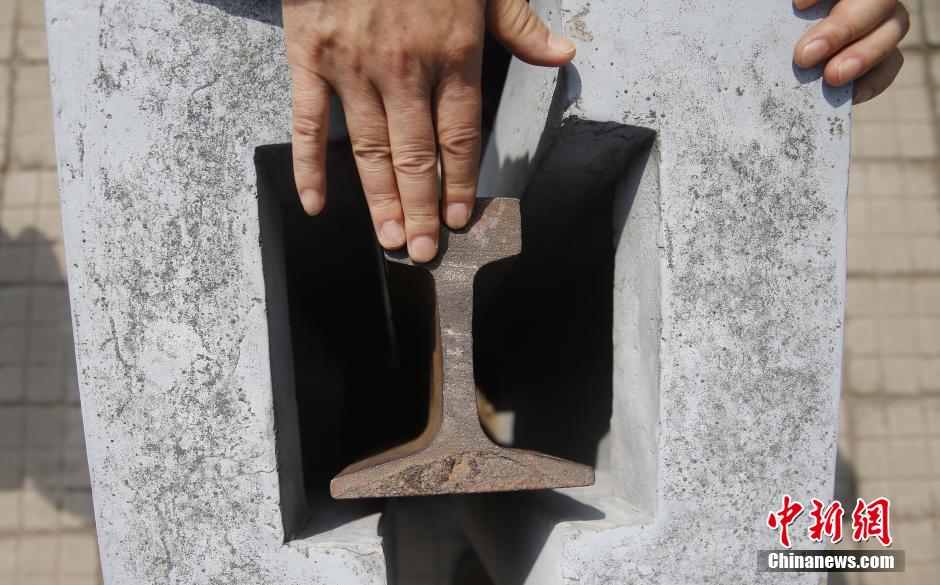Yang touches a rail track sign erected in 1905, which indicates that the spot is the intersection of the Great Wall and the railway. (Chinanews/Zhang Hao)