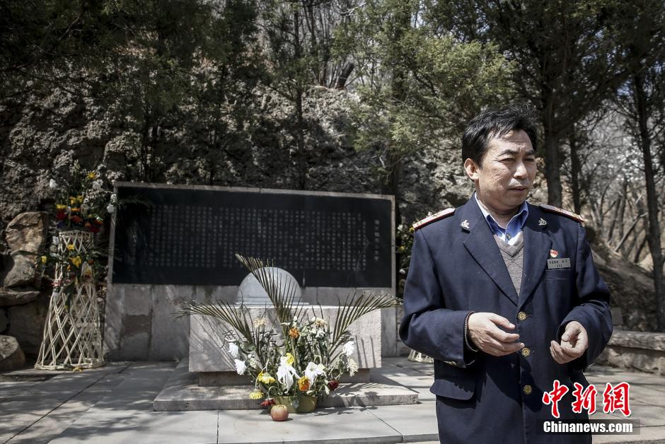 The grave of Zhang Tianyao was moved behind his bronze statue in 1982. Since then, Yang and other workers of the station have also worked as the keeper of the grave. (Chinanews/Zhang Hao)