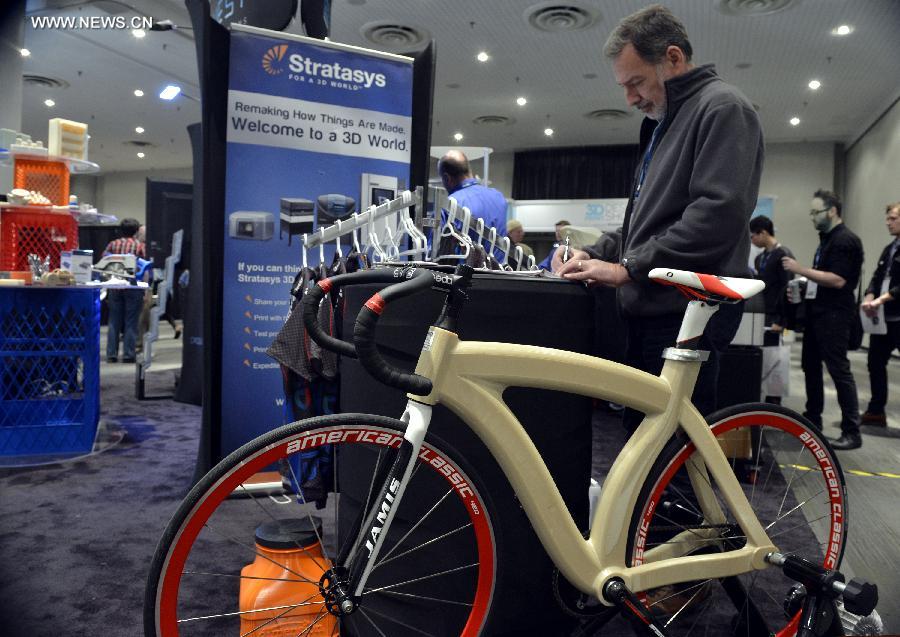 A 3D printed bicycle is on display at the 3D Print Design Show in New York, the United States, April 16, 2015. The 3D Print Design Show is held on April 16 and 17 in New York. (Xinhua/Wang Lei)