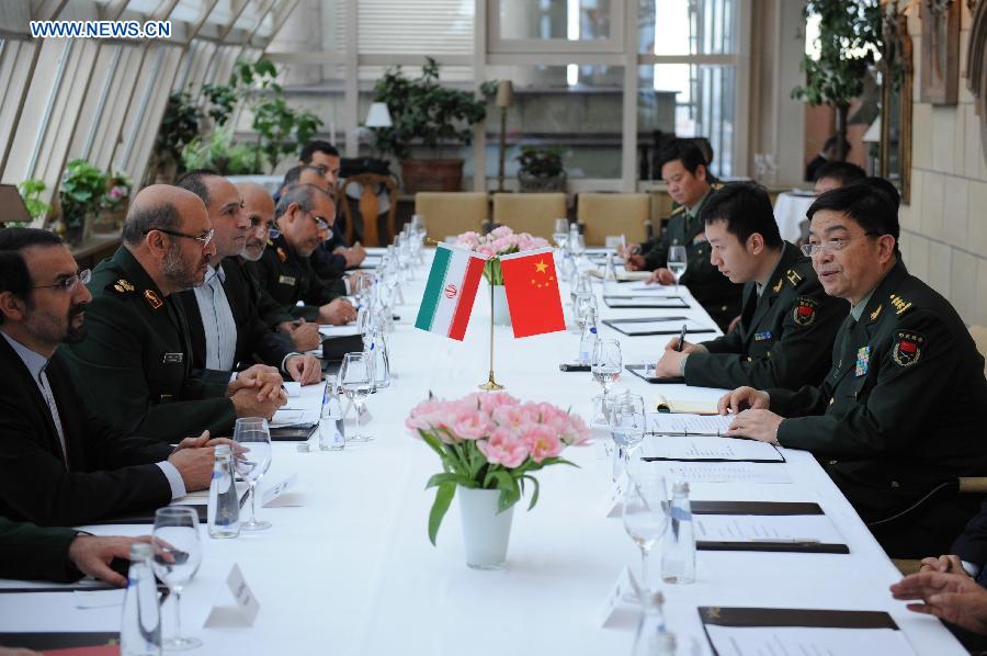 Chinese State Councilor and Defense Minister Chang Wanquan (1st R) meets with Iranian Defence Minister Hossein Dehghan (2nd L) attending the 4th Moscow International Security Conference inRussia, on April 16, 2015. (Xinhua/Dai Tianfang)