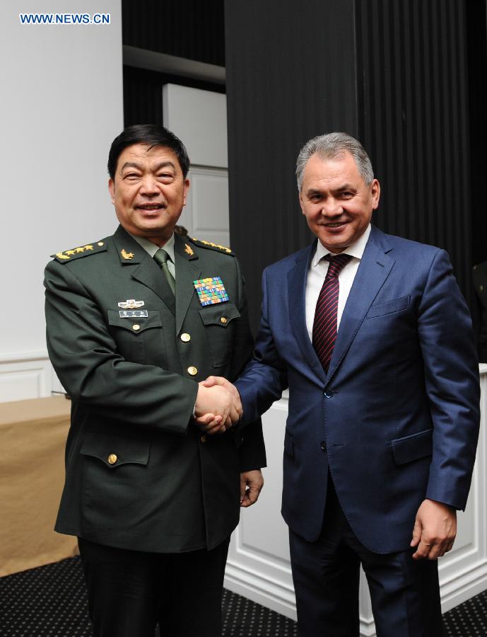 Chinese State Councilor and Defense Minister Chang Wanquan (L) meets with Russian Defence Minister Sergei Shoigu attending the 4th Moscow International Security Conference inRussia, on April 16, 2015. (Xinhua/Dai Tianfang)
