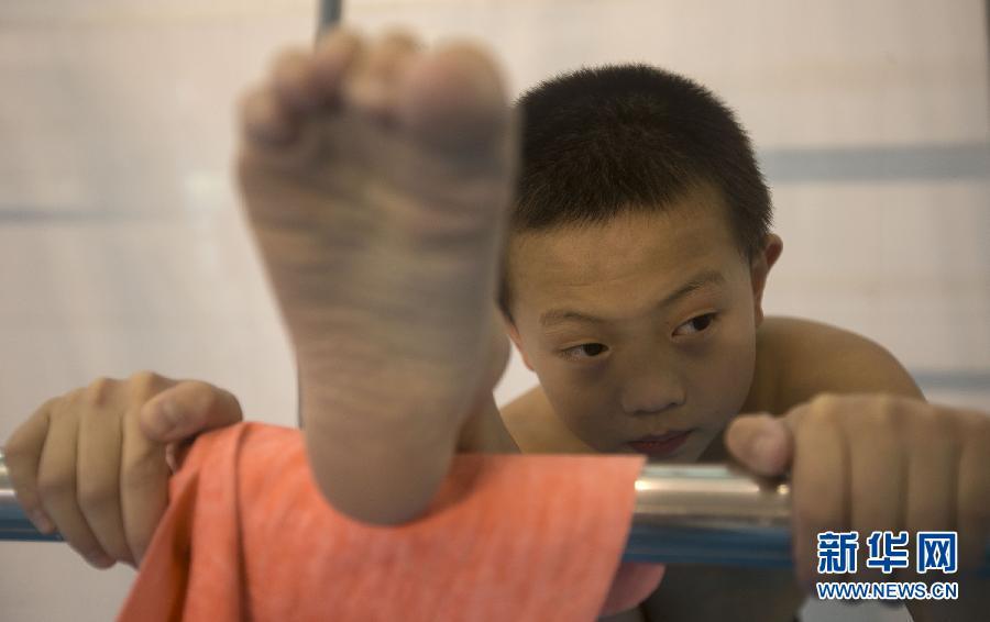 8-year-old Zhang Jiaxin stenches legs after the training at the swimming center of Dongguan, Guangzhou, April 14, 2015. (Xinhuanew/Fei Maohua)